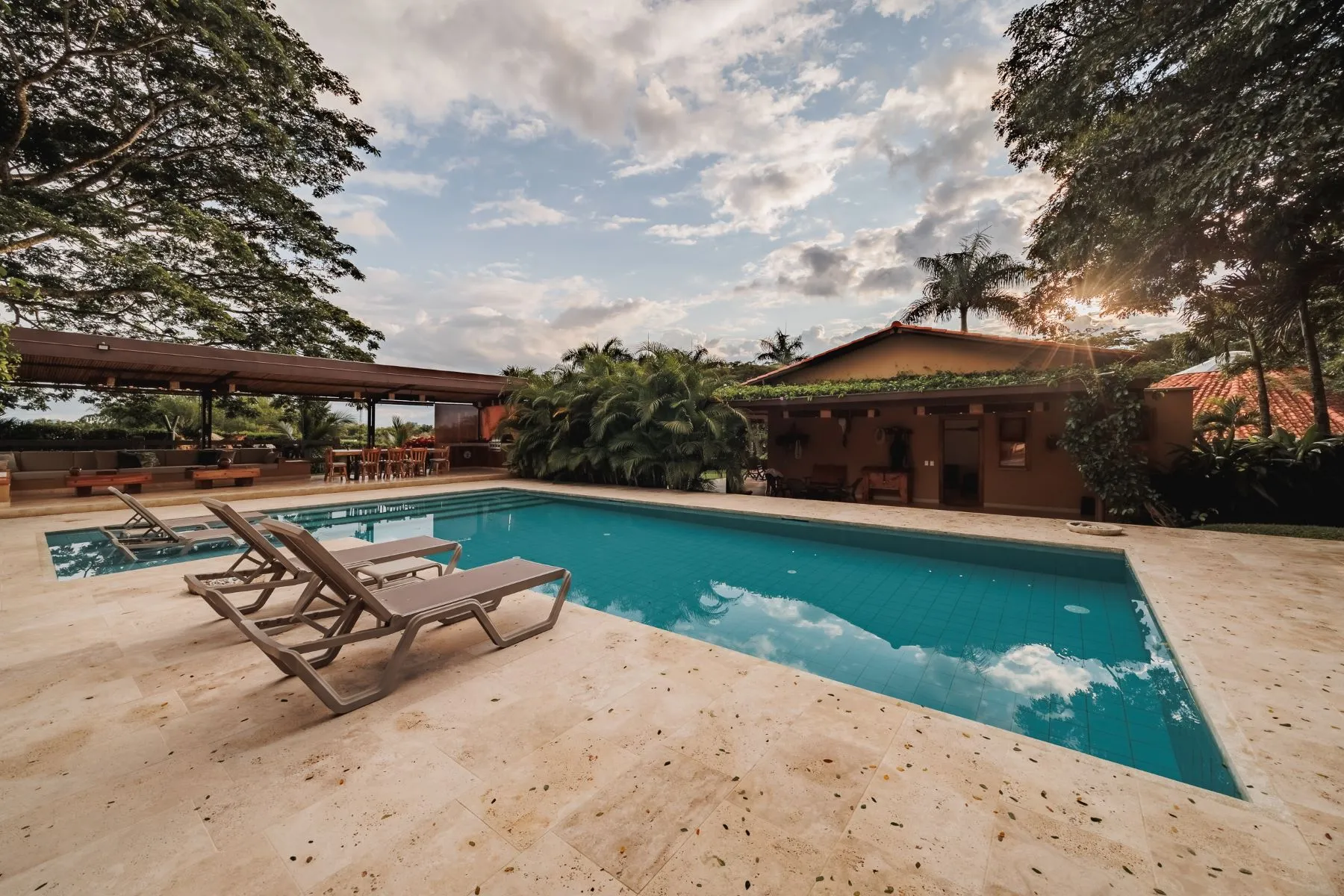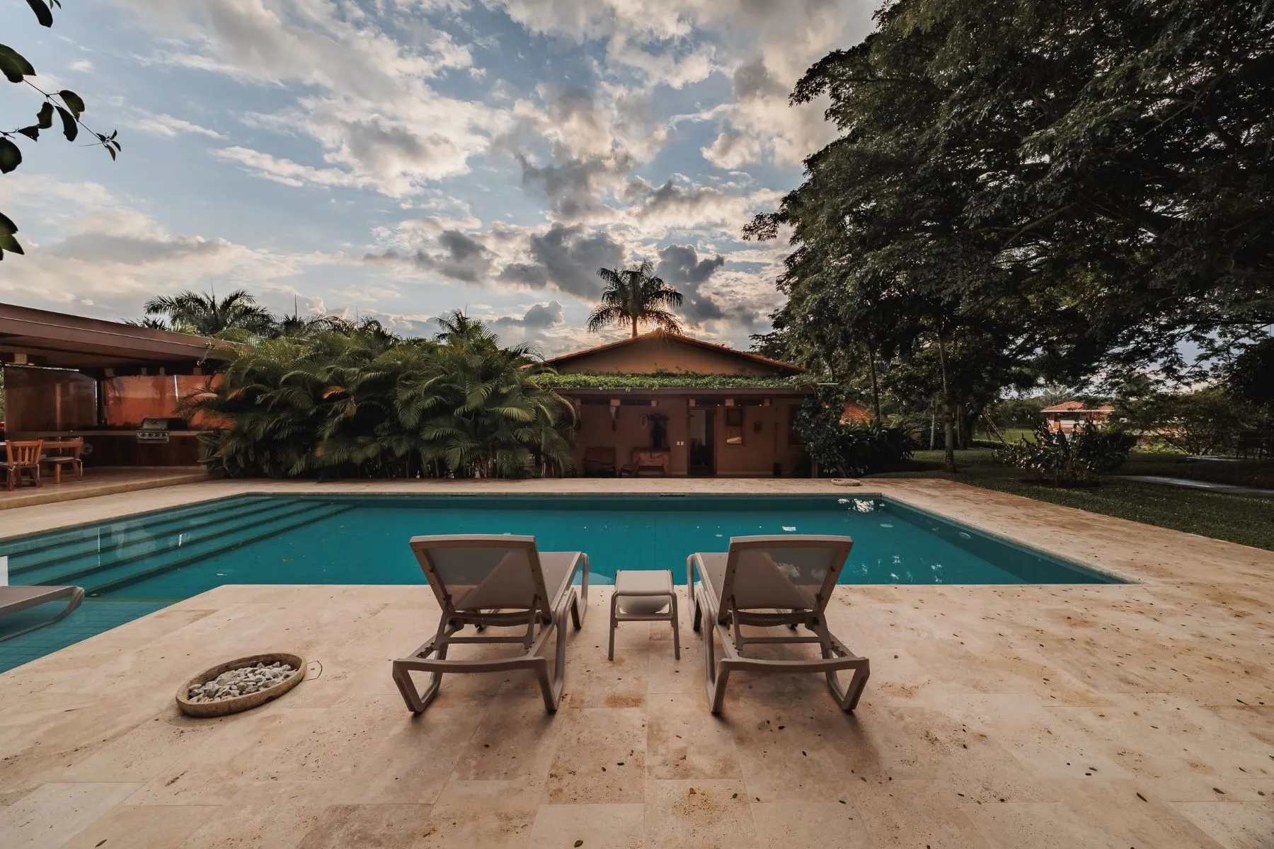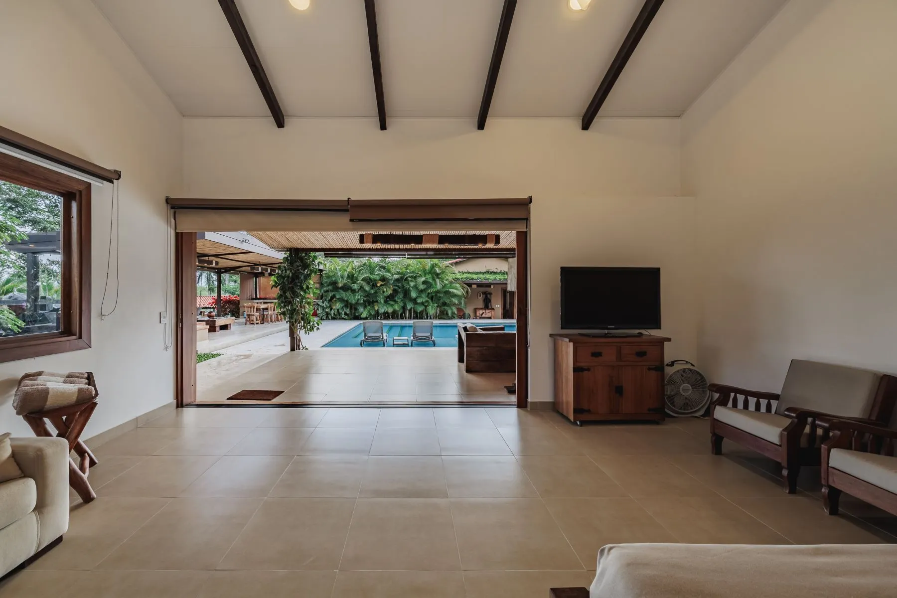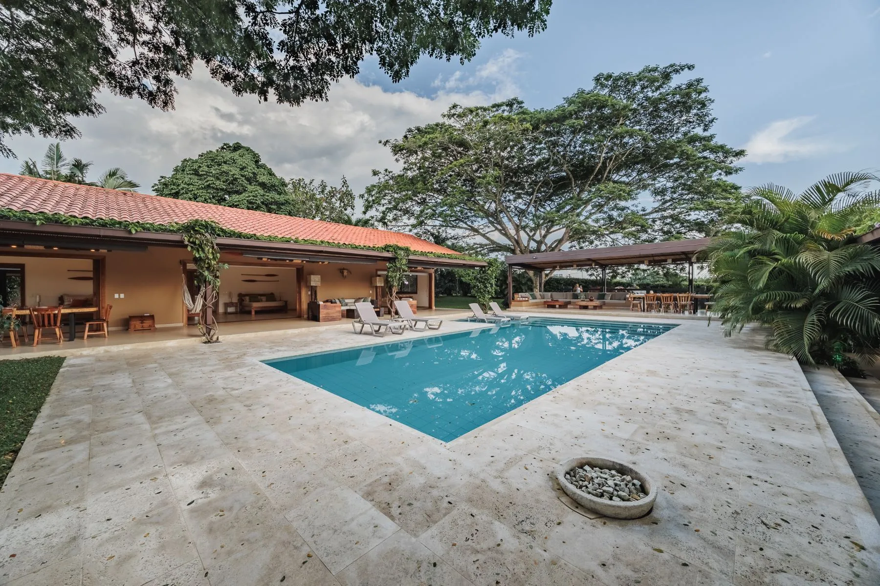 Los espacios interiores se abren hacia el exterior de manera fluida. Cuatro salas y cuatro comedores, cada uno con su ambiente propio, permiten disfrutar de momentos diferentes a lo largo del día. Desde un desayuno tranquilo bajo la sombra de los árboles hasta una conversación junto a la piscina al final de la tarde, todo invita a vivir despacio y con propósito.
