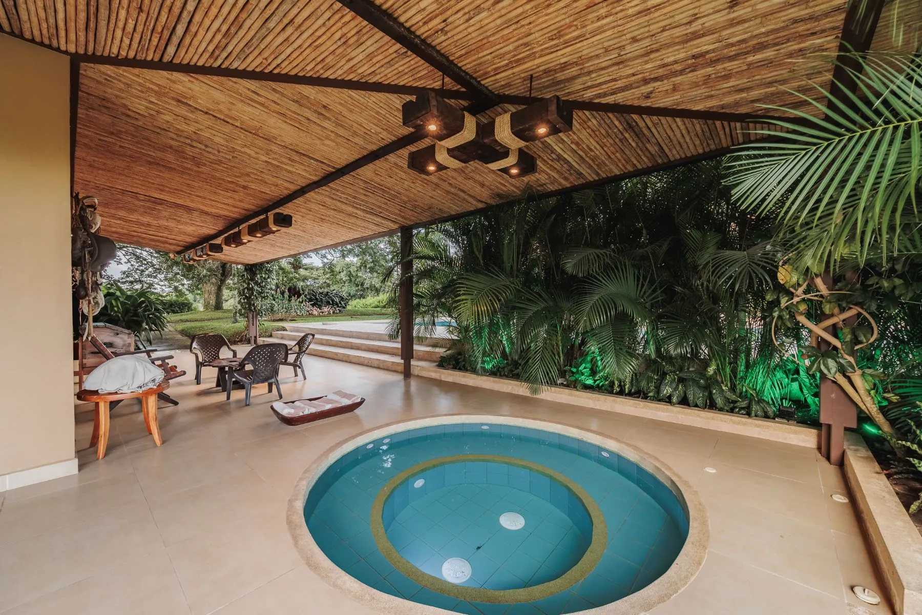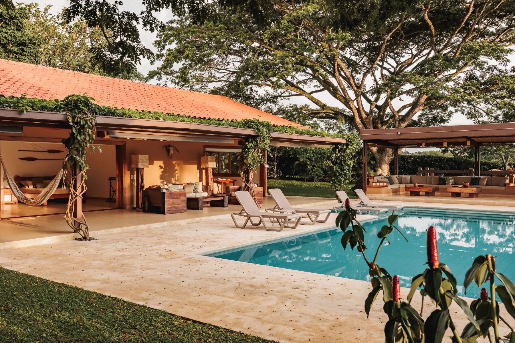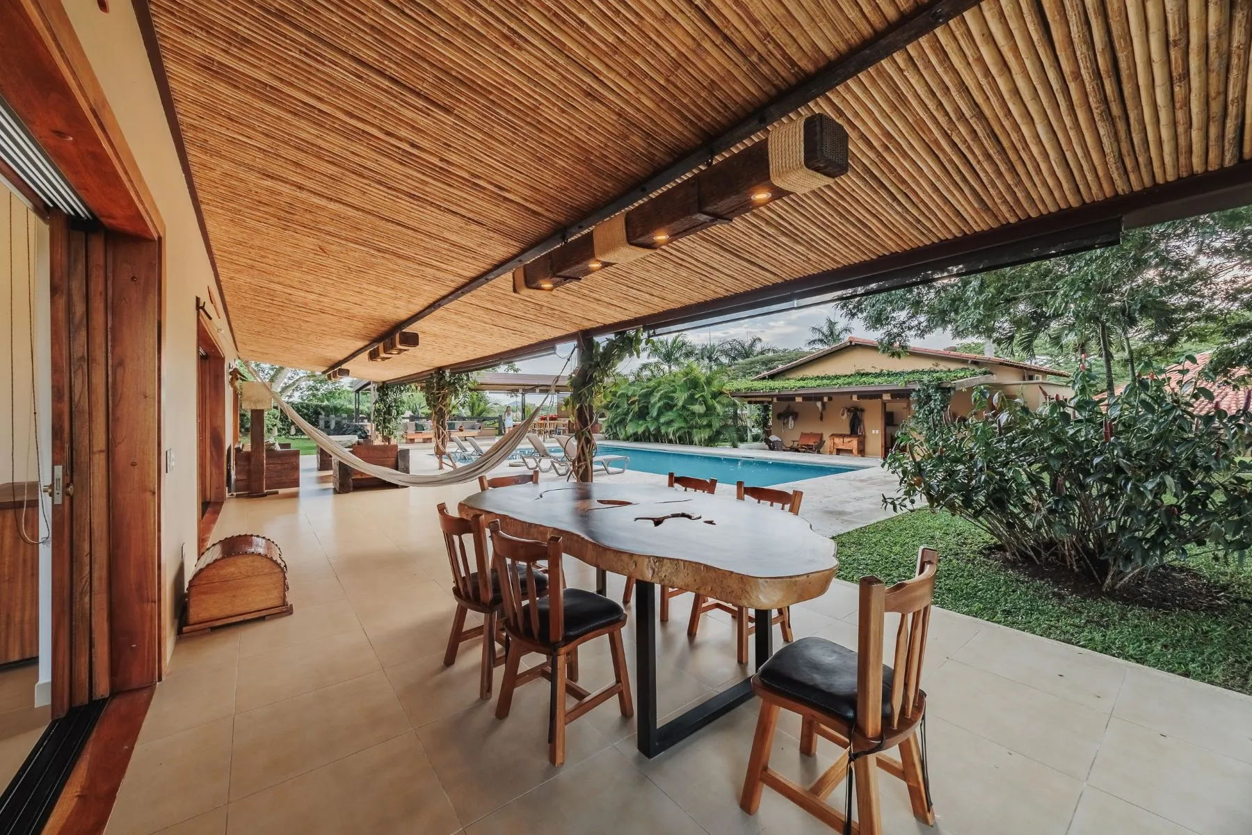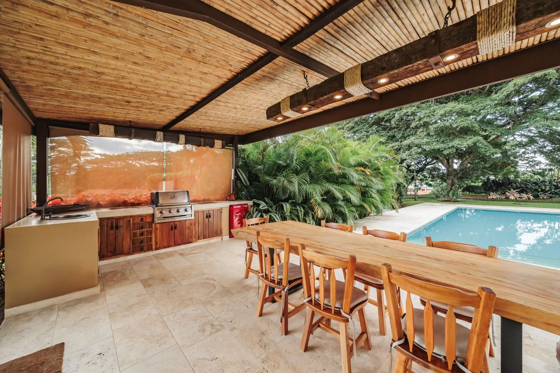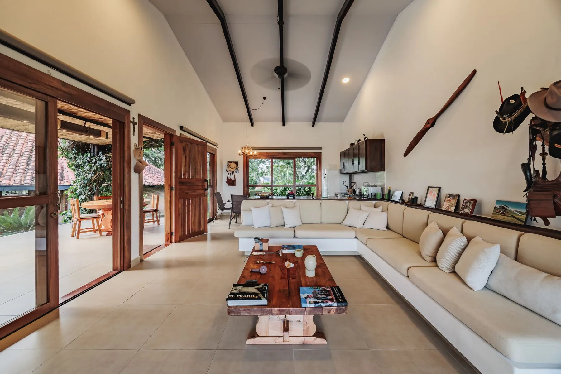 Los espacios interiores se abren hacia el exterior de manera fluida. Cuatro salas y cuatro comedores, cada uno con su ambiente propio, permiten disfrutar de momentos diferentes a lo largo del día. Desde un desayuno tranquilo bajo la sombra de los árboles hasta una conversación junto a la piscina al final de la tarde, todo invita a vivir despacio y con propósito.
